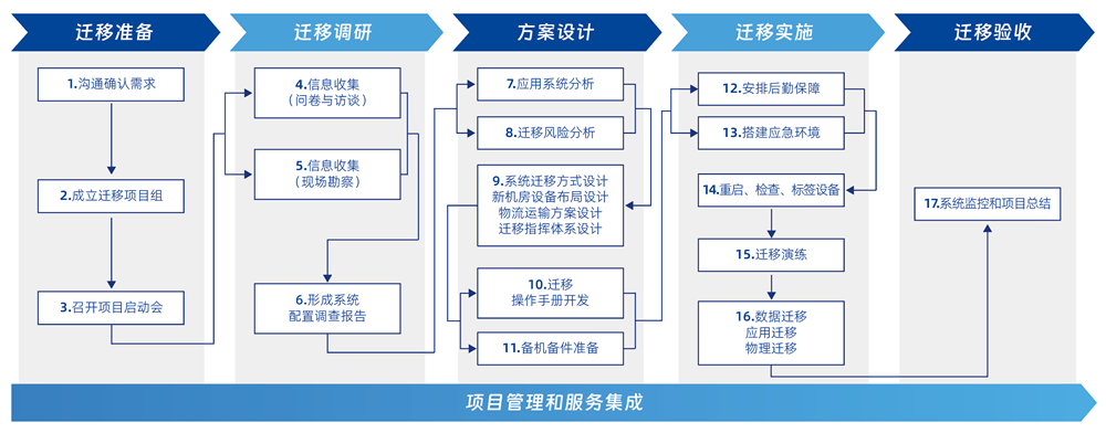 帮助客户进行数据中心的各类迁移服务,,,,包括传统数据中心及新一代云数据中心的 IT 基础设施设备迁移、、、、系统迁移、、、数据迁移、、、、应用迁移、、、同城灾备/双活、、、、异地容灾等各类场景迁移。。。。设备包含主机、、存储、、、网络、、、、服务器、、云平台、、数据库、、、中间件、、、应用、、、、灾备系统等各类软硬件。。迁移服务通过制定迁移策略和计划,,组织高效、、、准确地执行迁移,,并在既定等停机窗口内完成数据中心的搬、、、迁、、建、、、管、、谋等过程。。。。 一站式集成迁移服务能力:新一代数据中心规划、、建设、、、、优化、、容灾、、、迁移、、、、物流、、备件、、、、运维
